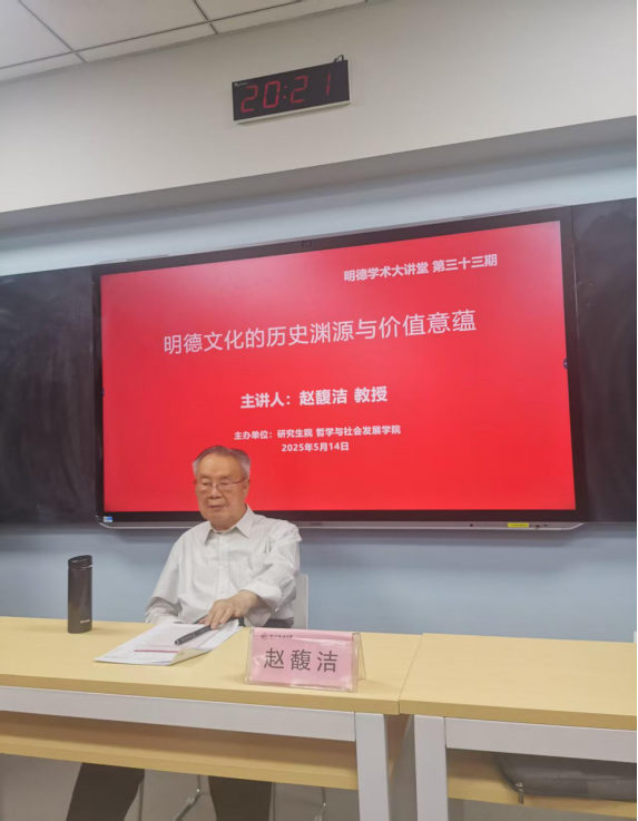 5月14日晚19:00,由西北政法大学哲学与社会发展学院和研究生院联合主办的“明德学术大讲堂第三十三期”在雁塔校区三号教学楼3605教室顺利举行。西北政法大学资深教授赵馥洁作题为《明德文化的历史渊源与价值意蕴》的学术报告,报告由校党委委员、研工部部长宋白主持。哲学与社会发展学院、马克思主义学院教师代表、博士研究生、硕士研究生一百余人参加报告会。