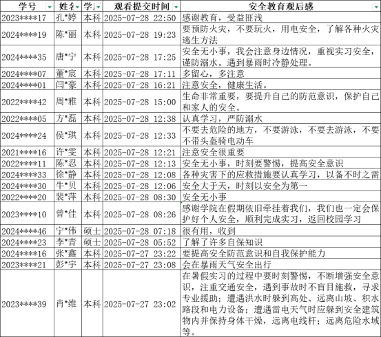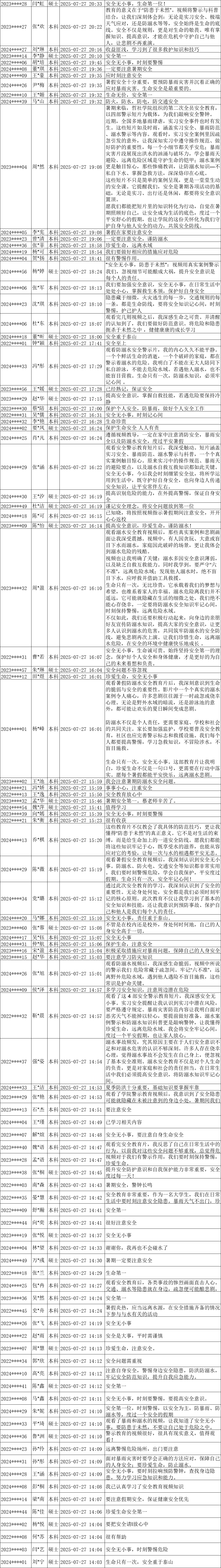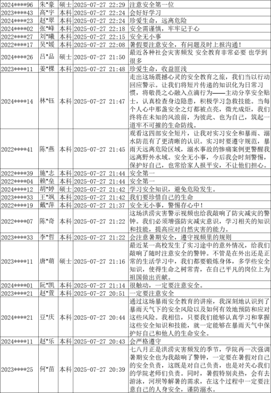 7月27日—30日,为提升学生安全防范意识与自我保护能力,哲社学院开展了暑期第二次全员安全教育活动,活动覆盖全体本科生、研究生。