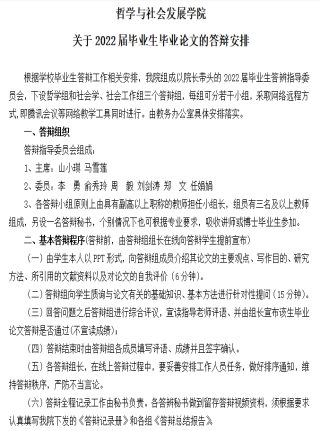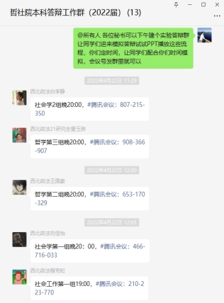 根据学校文件要求和学院拟定的线上答辩程序,哲学与社会发展学院教务办在马雪莲副院长的带领下进行了周密的策划部署和模拟演练,具体步骤有:提前一周收集答辩学生的准备材料、教务秘书线上组织答辩秘书进行流程培训、组织学生提前进行模拟答辩、向答辩组成员教师发布注意事项等。以上准备工作成功排除了部分学生的设备故障、提升了学生们线上讲解PPT及答辩的操作熟练度、优化了答辩流程。