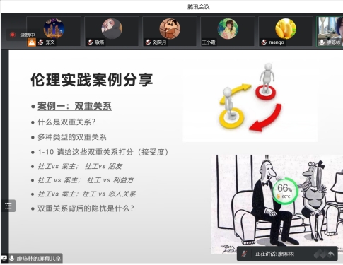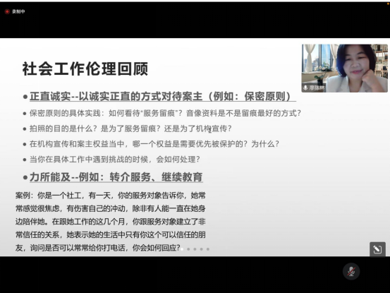 本次讲座廖陈林老师首先探讨了在社会工作者的权力、案主价值和尊严的实现、案主是否能完全自决等问题;接下来,以自己的实务经历为案例,论述了社会工作伦理原则在实务场景的应用技巧、面对困伦理境社工如何抉择以及社工从业中的问责机制及保护机制。最后,陈林主任分享给广大的社会工作专业学生——“我仍然相信我们个人的影响力和改变世界的使命”的话语作以激励和引导。