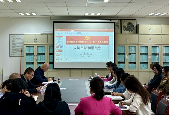随后,宣讲人俞秀玲副教授将党的二十届三中全会精神紧密结合学院的学科特点,从人与自然和谐共生的角度,结合中华优秀传统文化,进行了宣讲,使全体参会人员对党的二十届三中全会精神有了更深刻的理解和认识。