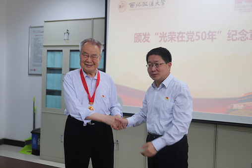 活动开始前,孙国华向陕西省社科联名誉主席、我校资深教授赵馥洁颁发“光荣在党50年”纪念章,向赵馥洁教授致以崇高的敬意。