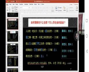 刘笑敢教授从比较哲学和比较语言学出发,首先区分了老子哲学之“自然”概念与西方语言学或哲学意义上的“nature”概念,二者完全不是一回事,老子关于“自然”的学说凸显的是人文世界中自然而然的秩序,内无冲突,外无压迫,老子的自然观是天下秩序的整体和谐与个体自在的统一。与儒家哲学以自我为中心的同心圆式秩序、亲属贵贱之分不一样,道家哲学强调“以天下观天下”,是一种一视同仁的天下整体秩序。这种秩序导向的是和平、平等、和谐、万物自由自在的成长发展。这种秩序落实在政治哲学的领域,就是所谓“(圣人)辅万物之自然而弗能为”,在这种自发秩序中,圣人为而不恃,利而不争,大小多少,以德报怨,包容异己,最终实现的是天下整体的自然和美好,这个秩序观照下的世界是一个生机勃勃、生意盎然的世界。同时,刘笑敢教授展开东西对比,老子这种以“人文自然”为最高原则的人文主义思想与马斯洛的人本主义心理学有着近乎一致的见解,也与Steven·pinker所呼吁的“人性中的善良天使”有着近乎一致的诉求。老子人文自然观的要点包括以雌柔慈爱为内心常态、以无差别之心包容天下、以“辅”为上的治理原则、以自然和美为理想社会的目标。