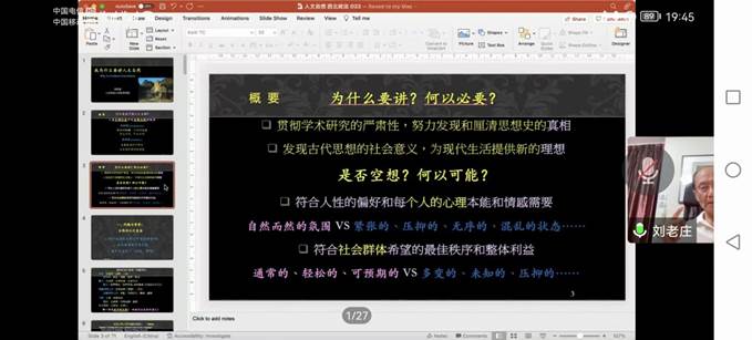 刘笑敢教授本场学术报告持续两个半小时,整场报告学术视野极为开阔,知识含量极大,人文关怀极强,是一场既有学术严谨性又有社会关怀温度的学术盛宴,彰显了一代哲人问道不止、厚德载物的大家风范。我校以及来自全国各地的近二百名听众在线分享了本场学术报告,报告结束时刘先生与广大听众进行了热烈的学术互动。