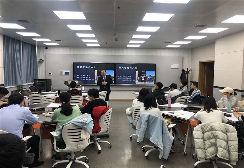 吴教授通过对中国传统社会价值观的反转与生动形象的故事,向同学们生动地阐明了“为”与“不为”的意义所在,为则实现生命的可能,不为则体现生命的必然。在讲座的最后,吴教授通过巧妙地引用儒释道交融的智慧与对培养“豪气”的经典作用的阐发,讲述了儒道互补的中国传统经典智慧。