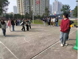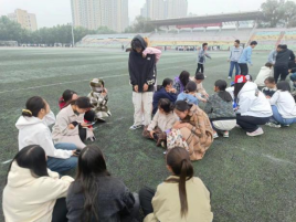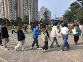 2023级本科生同学在田径场和篮球场上开展了丰富多样的心理素质拓展活动,进行了“丢手绢”、“搭石塔”“两人三足木头人”“爱的抱抱”等多项游戏。