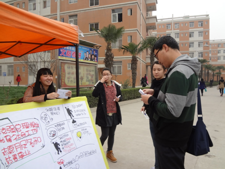 3月13日——17日在专业课靳宇老师的统一安排下,2012级社会工作专业学生积极准备,通过学校的广播站合作及校园广播,广播站的微信、微博、人人官方平台,赢起一定的点击量,在活动开展前通过板报宣传,印发关于社会工作的知识的宣传页,在3月17日我校宿舍区定点开展社工基本知识宣传与社工常识有奖竞答、签名纪念等活动,取得良好的宣传效果。