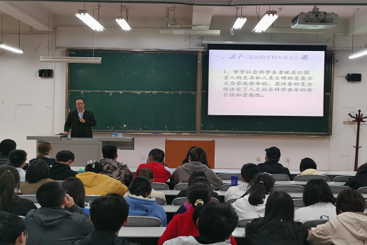 接着张周志教授从“志于道、据于德、依于仁”三个方面同学生们探讨立身成才之道。他讲到,哲学社会科学本身就是以人的生存和人类文明的发展方向为探究对象的,而“人能弘道,但为道日损”。“天将降大任于斯人”,这就要求哲学社会科学必须迎难而进,要求我们要直面人生的难题,学以成人,学做好人。