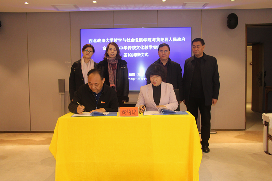 签约仪式上,樊宝峰首先介绍了黄陵县经济社会发展情况,周忠社从学校办学特色、办学理念、学院发展以及人才培养等方面,并就此次签约和下一步合作进行了发言。随后,周忠社和杨玉梅分别代表双方签订合作协议,周忠社、樊宝峰、杨玉梅共同为中华传统文化教学实践基地揭牌。